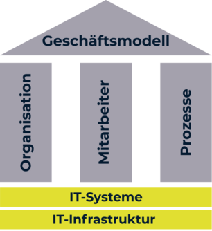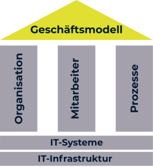 Das House of Transformation beschreibt das Unternehmen als Haus mit Dach, Säulen und Fundament – und sorgt dafür, dass Strategie, Struktur, Menschen, Prozesse und IT nicht länger gegeneinander arbeiten. Statt in isolierten Projekten zu denken, werden Abhängigkeiten sichtbar: Wo ein neues Geschäftsmodell entsteht, müssen Organisation, Prozesse und Systemlandschaft nachziehen, damit Wachstum und Skalierung tatsächlich möglich werden.